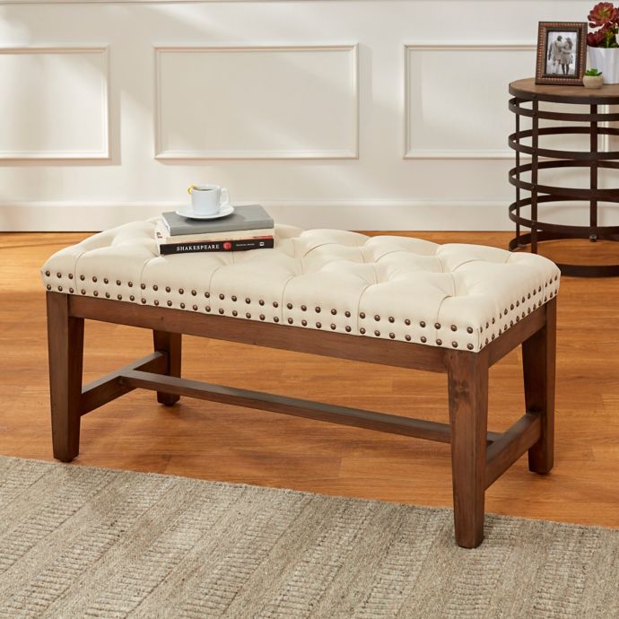 Tufted Linen 39 Inch Wood Bench With Bronze Nail Heads In Cream